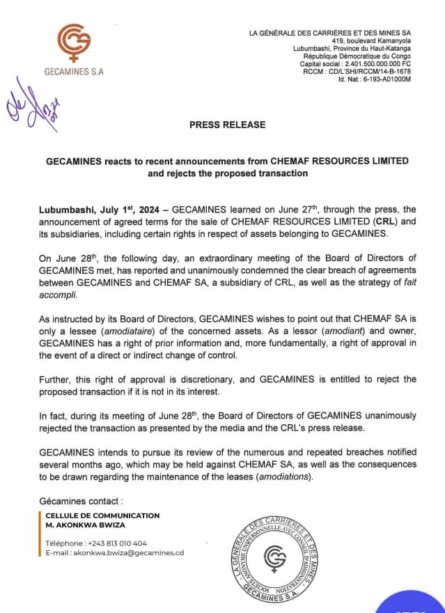 GECAMINES reacts ot recent announcements from CHEMAF RESOURCES LIMITED and rejects the proposed transaction Publié par : INSTANTnews 3 juillet 2024 Article précédentMESSAGE DE FELICITATIONS DU DIRECTEUR GENERAL DE L’INSTITUT NATIONAL DES ARCHIVES DU CONGO (INACO), ADRESSE A SON EXCELLENCE MADAME JUDITH SUMINWA TULUKA, POUR VOTRE NOMINATION AU RANG DE PREMIERE MINISTRE DE LA REPUBLIQUE DEMOCRATIQUE DU CONGOArticle suivantRDC : La Gécamines SA attire l’attention du public sur des faux offres d’emploi (Communiqué) Dans : Annonces Partager FacebookTwitterPinterestWhatsApp Sur le même thème Annonces Message de voeux de GECAMINES SA adressé à Son Excellence Madame la Première Ministre... Lire la suite Annonces Message de voeux de GECAMINES SA à Son Excellence Monsieur Félix-Antoine TSHISEKEDI TSHILOMBO, Président... Lire la suite Annonces MESSAGE DE VŒUX DE GECAMINES SA ADRESSE A SON EXCELLENCE MADAME LA PREMIÈRE MINISTRE... Lire la suite Annonces 30 juin 2025 : Message de vœux de Gécamines SA au Président de la... Lire la suite