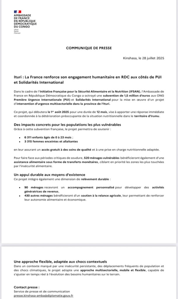 L’Ambassade de France en République Démocratique du Congo (RDC) annonce la signature d’un nouvel engagement humanitaire à hauteur de 1,5 million d’euros. Cette initiative marque une étape significative dans la consolidation des efforts de solidarité française envers la RDC, en mettant l’accent sur le renforcement des capacités humanitaires sur le terrain. La cérémonie de signature s’est tenue en présence de M. Rémi Maréchaux, Ambassadeur de France en RDC, et de M. Eugide Lale Mbunda, Chef de mission de l’ONG Première Urgence Internationale. Ce partenariat avec des organisations non gouvernementales reconnues, telles que Première Urgence Internationale et Solidarités International, témoigne d’un engagement durable et concerté pour répondre aux besoins humanitaires croissants en RDC.